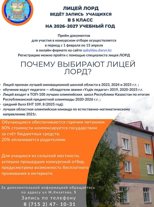 Құрметті ата-аналар! 2025 жылғы 1 ақпан мен 15 сәуір аралығында ЛОРД дарынды балалар үшін мамандандырылған облыстық мектеп-лицей-интернатына qabyldau.daryn.kz сайтында онлайн тіркеу жүргізіледі.