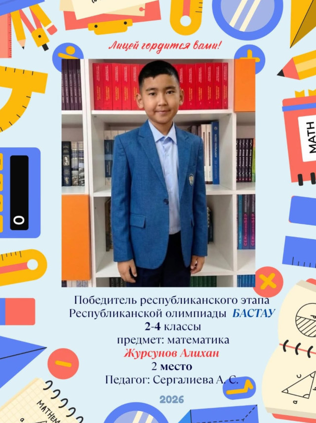 Алматы қаласында өткен “Бастау” олимпиадасының республикалық кезенінің математика пәнінің 2 орын жүлдегері Журсунов Алиханды және жетекшісі Сергалиева А.С. марапатпен шын жүректен құттықтаймыз!