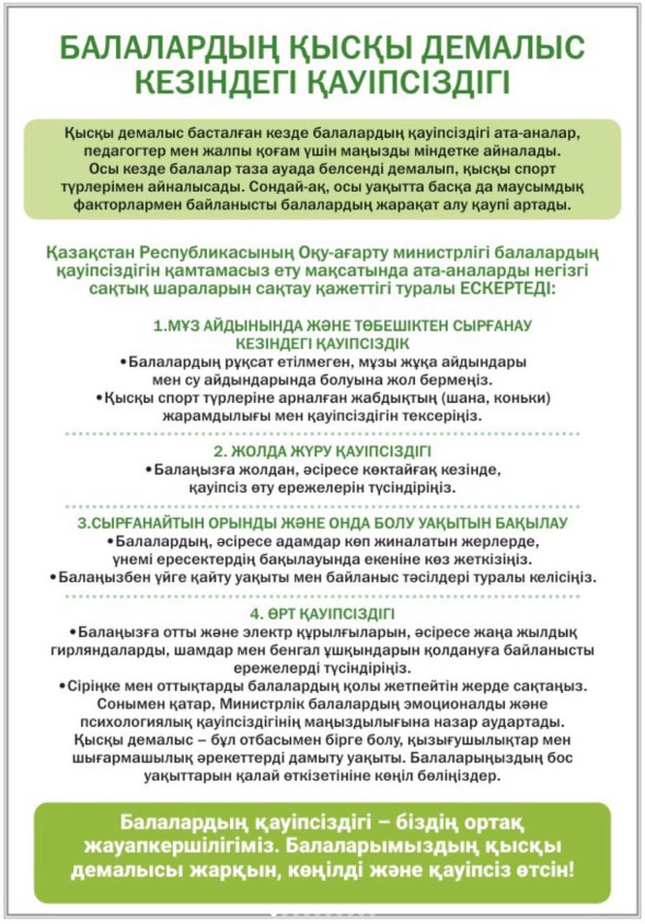 Балалардың қысқы демалыс кезіндегі қауіпсіздігін қамтамасыз ету және осы мезгілде балалар өлімі мен жарақаттанудың алдын алу үшін «Балалардың қысқы демалыс кезіндегі қауіпсіздігі туралы» жадынама әзірленді.