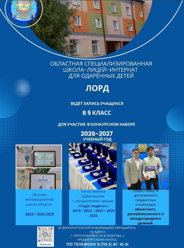 Құрметті ата-аналар! ЛОРД лицейі 2026–2027 оқу жылына 5-сыныпқа байқау негізінде қабылдау үшін оқушыларды тіркеу жүргізуде. Алдын-ала жазылу телефоны: 8-7152-47-10-31