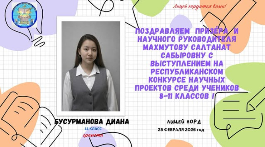 Республикалық ғылыми жобалар байқауынында керемпт нәтиже көрсеткен 11 “Б” сынып оқушысы Бусурманова Диананы құттықтаймыз!