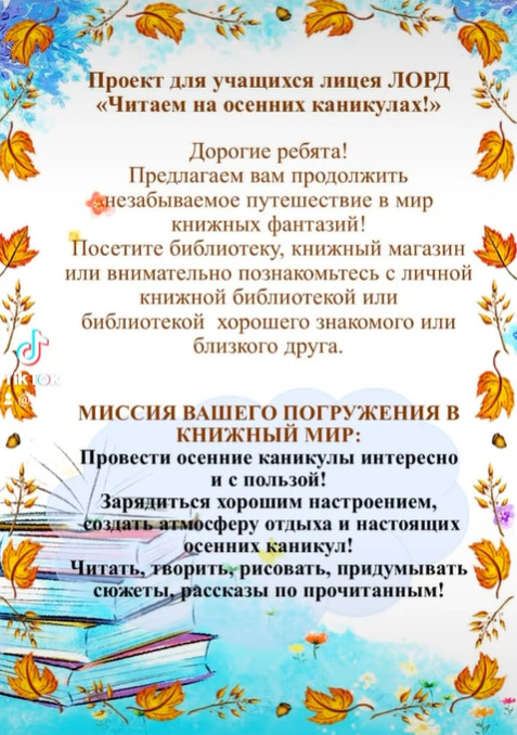 В лицее ЛОРД в каникулярное время продолжается реализация проекта «Читающая школа». «Читающая школа» — это больше, чем образовательный проект. Это вклад в формирование личности будущих поколений, умеющих не только получать информацию, но и мыслить критически, сопереживать и творчески выражать свои мысли. Чтение на каникулах позволяет вовлекать родителей и других членов семьи в формирование у детей привычки к регулярному чтению.