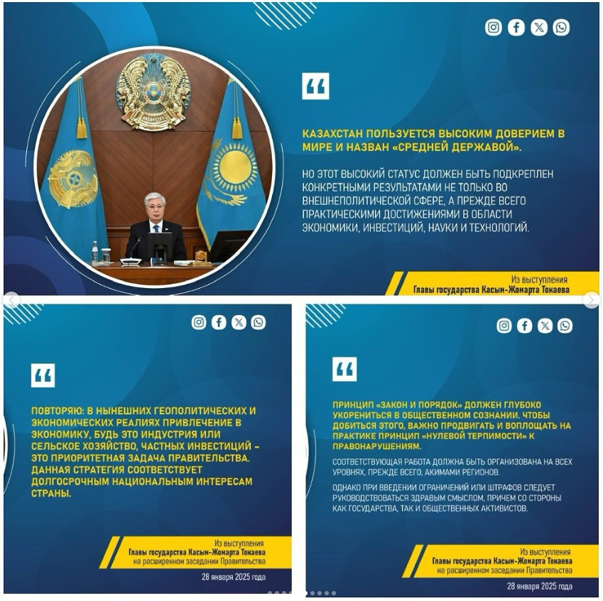 28 января 2025 года в Астане Президент Касым-Жомарт Токаев выступил с речью на расширенном заседании Правительства и поставил ряд задач на ближайшее время. На заседании были озвучены основные задачи и приоритеты Правительства, других уполномоченных органов на ближайший период.