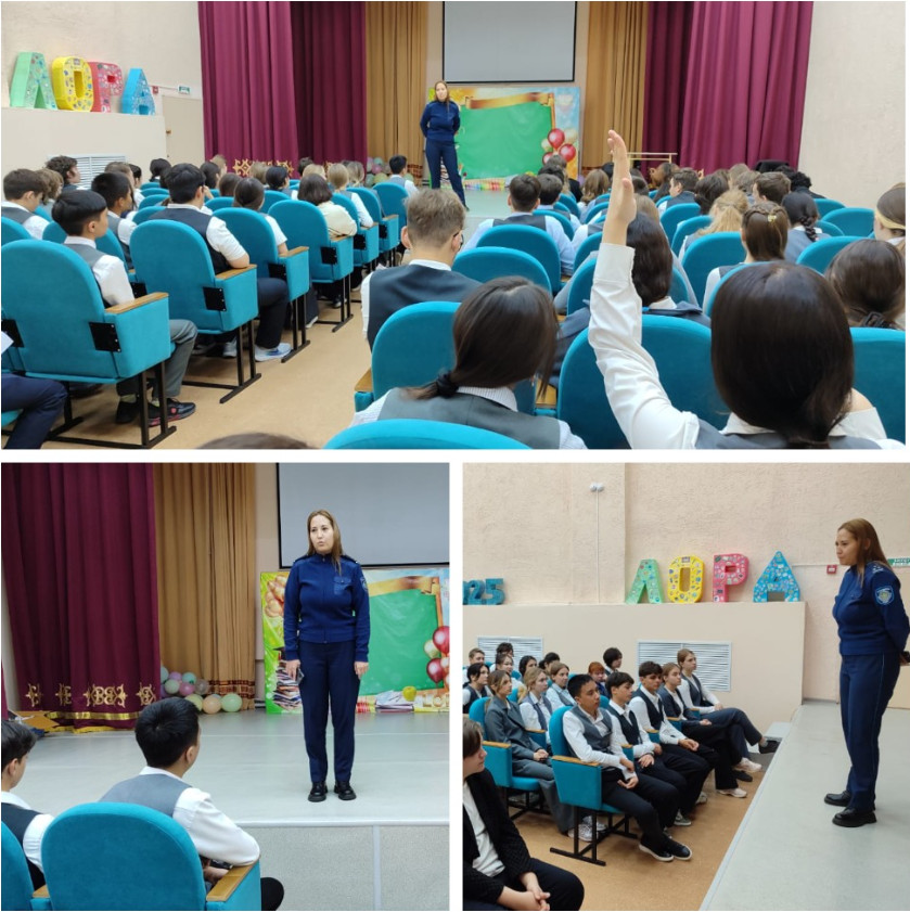 13 октября старший лейтенант полиции Наурзабаева Дана Касеновна провела беседу с учащимися 9-11 классов по вопросам профилактики буллинга в школьной среде, о мерах ответственности несовершеннолетних и их родителей за нарушения статей административного и уголовного кодекса РК. Особое внимание инспектор уделила вопросу соблюдения режима дня и правилам нахождения несовершеннолетних в развлекательных заведениях.